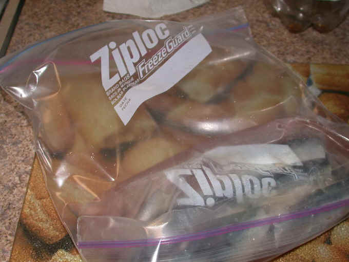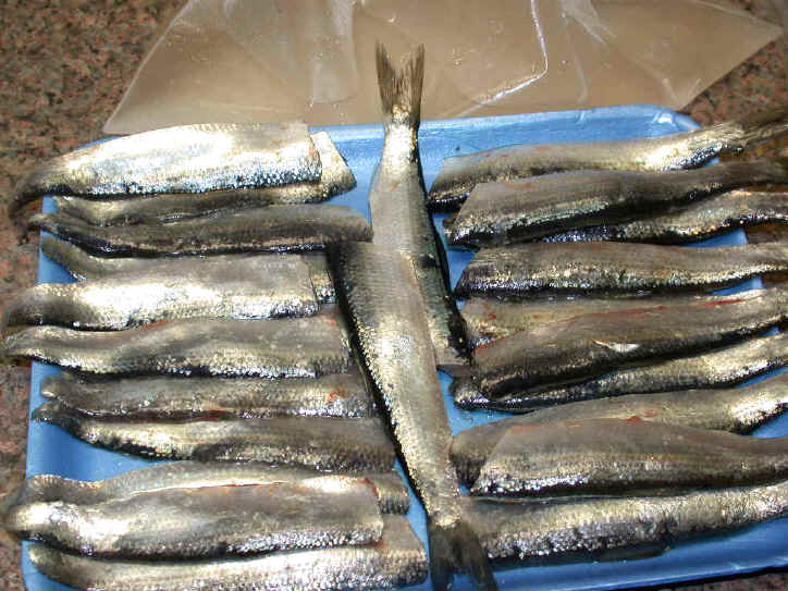 Photo 17. This image shows in great detail what the "A" side looks like after it's trimmed to a little over an inch. The overall length should not exceed 6 inches. If it does?.....it might not spin properly. Trim the front part of the bait on an angle to match the bait head holder. Photo 18. This what the trimmed herring fillet is gonna look like and I always have a spare bait head handy to make sure it fits just right. Please note most of the scales are still attached. Now, this is what Reel-Salmon meat is supposed to look like. I'm sure you'll agree to the irresistible natural presentation of the outward appearance of this bait! Photo 19. This is the "B" side. You'll see the top and bottom have been transposed, but never the less the Salmon still chomp on it. With me it's the personal preference to the "A" side, however results with the "B" side seem to be pretty darn close to the "A" piece. Photo 20. Please examine this photo very closely. I took this image to show you what 24 cut pieces of Salmon bait look like before it goes into the special brine mix. You can see the original baggie of brine, or juice I started the thaw process in this photo. Be sure to save that stuff....it contains the herring oil and initial juices (smell) from the herring. Be do the work yourself the savings will amount to about 70% of purchasing the commercially prepared stuff. I'd also guesstimate self-prepared herring strips out-fish the commercial stuff by at least 50% from my experience from what I seen in fair head-to-head tests on the boats I was on. It wasn't that we didn't catch fish on the commercial 6 strips in a tub, we caught more on the homemade herring. Tip: Put the cut-up herring in a Zip Lock gallon sized baggie in the same baggie you started this process out of. Do not discard the original fluid, because it have has the herring oil in it. Never rinse the fillets either, it is essential not to overlook this step. Let your hands get gooky and leave the fishy smell on your paws. Scent is the deal! I use a paper towel if my hands get too messed up. |