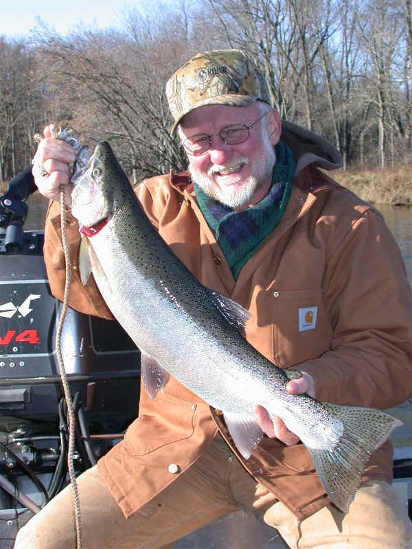Our grand excursion into the unknown on November 14, 2003 began at my house at 7:15am. My partners, Warren Knapp and Capt. Tom Rasmussen showed up at the agreed time. This was a rare opportunity for me to enjoy some of the finest company Manistee County could offer, meaning Tom and Warren! Our First Fish! Tom and Warren eased their lines into the drink with four T-4 Flatfish in various, but good colors. We slid downstream about 40 feet and the number 4 (or bank rod), right next to Tom took a soft bite. Drats, we missed that rascal,..... like I said, it was a soft hit. Re-setting lines we continued down the "run" for about another 20 feet and Warren's number 1 rod took a fierce whack. Maybe, a better description would be, that the Steelhead was trying to rip the rod out of the rod holder. But, I don't want to lay it on too thick this early in the story. Now, this Steelhead was a bright-silvery chrome hen, fresh in from Lake Michigan. She had a vile, contemptuous attitude akin of a pissed-off pit-bull! This large hen shot upstream and did her best to cut the line on our anchor rope. However, Warren's skillful duty with the rod coaxed the Steelie into the clear. After a hectic 10 minutes, Capt. Tom slid the net underneath a beautiful, radiantly-bright 9 pound hen. Hey, we were in business and under any circumstances ...we were not gonna get skunked today! Another One Bites the Dust After a couple of non-productive spots, we just started setting lines. Before all the rods were in the water, the number 3 rod took a bone jarring smack. This fish hit so hard, line was peeling off the reel, before Tom could get it out of the rod holder. Number two of the day was hooked-up ...good deal! After an ongoing struggle, a couple of jumps & some short, but determined line ripping runs ...it was almost in netting distance. Then that wicked varmint took off again for the other side of the river. Hey, no problem! Tom's masterful rodsmanship soon took it's toll and I was netting a decent male of about 7 pounds. Tom is no slouch at fishing, having ran charters out of Manistee for the past 20 some years. He definitely knows his stuff! There's no way I can't say enough about Tom's firm grasp of angling knowledge that spans several decades. Please let me add, Tom's a sheer joy to be around and a first class act at anything he does. Warren tain't so bad either! The Big Miss, or "Farm Job" We fooled around in a couple of holes to no avail, then I came to a narrow section in the river. I parked the boat in behind a massive log jam and instructed my team to get the lures back in the water. By this time heavy river traffic had broken loose pockets of leaves and debris had goofed up the number 2 rod. So, as I was helping Warren do a re-set when I seen a dandy metal-head doing cartwheels on the surface. Warren was picking up leaves off the floor of the boat and had not seen the strike. I yelled, "get that rod," and Warren was fast into his second fish of the morning. Well, to make a long story short, we lost that critter. But alas, I had a reason to tease Warren about his lack of attention and that was worth more to me, then if he'd have landed this missed fish. River Steelhead never seem to hit when your ready ...is the moral of this all-too-true story. Trifecta Trilogy I started to suck as a river guide "big time" and was putting Tom and Warren to sleep, due to a major lack of any fish activity. We had entered into an area that had hoards of Steelhead fishermen on the big river. Boats were everywhere and even finding a place to fish was a major problem. It wasn't looking good, and I very well knew it! Then this statement came to mind: "when the going gets tough, the tough get going." So, I powered back upriver to a first-rate run that showed show success numerous times in the past. By this time is was a little past 1:00pm and we didn't plan making it a long day on the creek. We'd slid the boat about 2/3rds through this hole, when the bank rod took a solid yank from a brawny Iron-Noggin. We soon found out this fish had some big shoulders and wasn't gonna be a easy deal to land. This was a