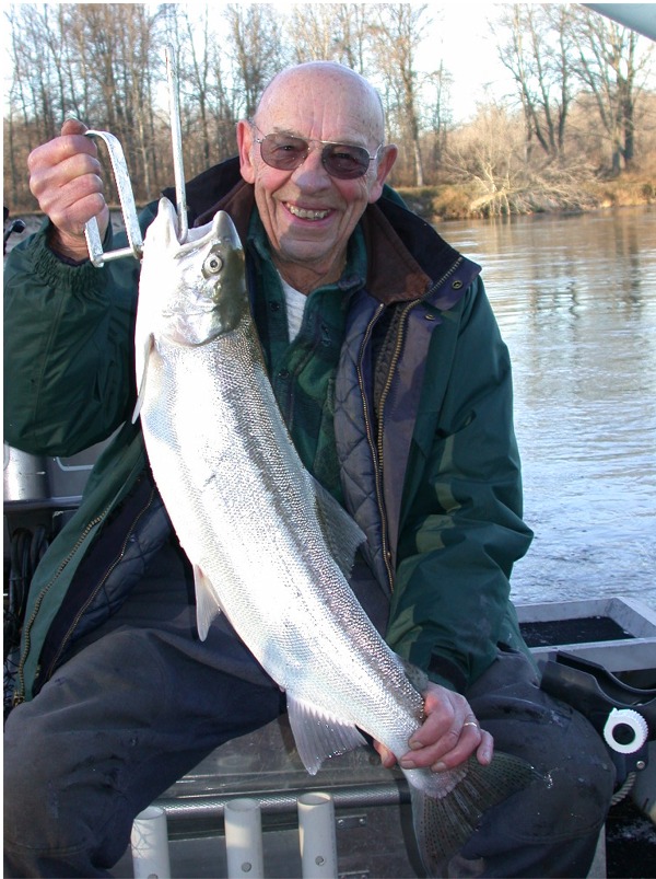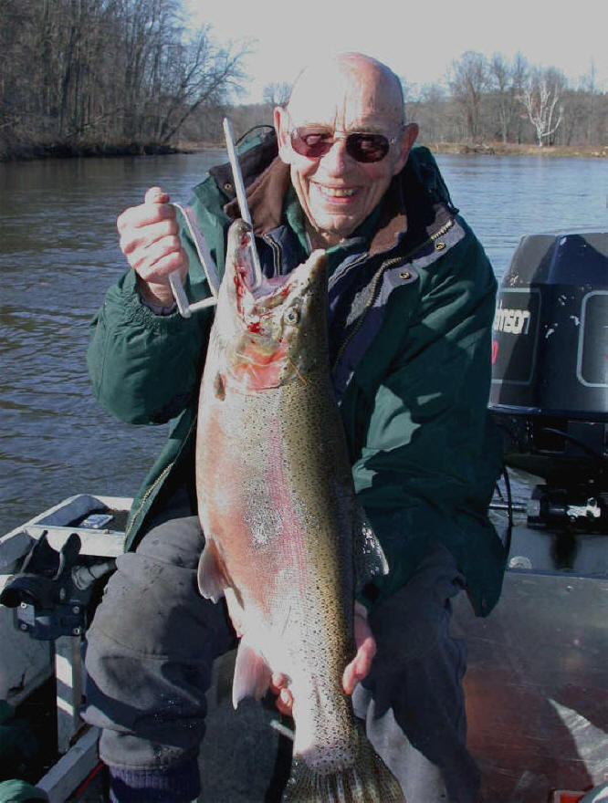 ...it was jumping right by a snag. My oars steadied our boat and we'd almost had this brute within netting range. Tom put his foot up on the rear transom and stretched the net way-out towards our advisory. With one fell swoop, Tom had our 3rd fish (14 pounder) of the trip in the net! I now felt relief and vindicated for sucking as a guide for about a 90 minute delay during mid-day. Yep, the thrill of victory, yeah ...buddy, this is what fishing is about, not the agony of defeat! The Best Part After the photo session of Warren's vividly colored, hook-jawed male of around 14 pounds we all toasted a warm cup of coffee. A good conversation developed and we swapped stories from the big lake Salmon season of 2003. We shared a fine discussion about our best days on the lake, because our memory is automatically programmed to delete the slow, or tough fishing days. You always tend to remember the sweet, and forget the bitter when it comes to fishing. Our chat lasted for at least 20 minutes and we concluded our trip around 1:30pm. Spending time with friends and sharing experiences like what Warren, Tom and I did today is what life is about. Making and taking time to enjoy yourself is a must, no matter who you are. In today's fast paced society, things like this get lost in the shuffle. Especially, if you're not careful enough to smell the roses on your way through this journey of life. Please pay heed to these last few words, and I'm sure you'll be happy you did! Reel Facts About Our Day We had better action away from the crowds as normal, because to much pressure shuts the fish down just like on the big pond. Two of our strikes came before we could get all four rods in the water, so what fish were there, I'd call....aggressive. Areas that held fish showed a wide dispersal and no one section was better then another. There are some Steelhead in the river, but not tons. This fact was evidenced (in most cases) we could only pry one bite per hole. Warren Knapp is a retired Fire Chief from Grand Rapids for the last 21 years and spends about 5 days a week trolling Lake Michigan from April well into September. Warren skippers the "Dotti K" and is better known then the lighthouse in Manistee's harbor. The "Dotti K" is a 18 foot Starcraft that harasses the waters off Manistee on a daily basis. Also, I use Warren as my official adopted father figure, because he's 79 years young and one of the finest gentlemen I've ever had the opportunity to meet. I guess what what bonds Warren is our combined passion of pursuing Michigan's Trout and Salmon. So, we're a natural for each other! Capt. Tom Rasmussen is a Manistee charter operator who skippers a 29 foot Black Fin yacht most days during season. Tom is one of the best fishermen that heralds from the Port of Manistee and runs a very clean program. He always shows his guests a good time and a full cooler of fish. I'd rate Tom's boat the "Sue Lee" as an asset to the entire charter industry on the Great Lakes. One heck of a nice guy is the best summation I can give, to keep from fumbling on my words. I almost forgot to say what a superb day we had. This was the best day we've had in a week with temps in the mid, to high 40's and plenty of warming sunshine. I think the overall blue skies help my attitude immensely, or I wouldn't have pounded out this article as soon as I got home from the river. Enjoy Friends Now! As a update to this story about 2 years after I wrote this piece, I have since lost my good buddy Mr. Warren Knapp. He died after a short, but determined battle with lung cancer. Warren lived to past 80 years and spend his last 20 years fishing everyday in season, after retiring from the Grand Rapids Fire Department. After re-reading this story, I count my